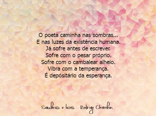 A apresentação dele é linda, muito cativante mesmo, mas achei que o conteúdo deixou um pouco a desejar. Talvez seja apenas um problema meu, mas eu não consegui me envolver tanto quanto achei que aconteceria. Não encontrei muita cadência e harmonia nos poemas, tanto em relação à métrica quanto em relação à abordagem de alguns temas. Achei os poemas um pouco desencontrados, sem uma linha de consistência. Não consegui sentir muita sensibilidade como senti com outros autores, ainda que muitos assuntos sejam mais sensíveis. Fiquei com a impressão de que tudo foi tratado com muita secura.